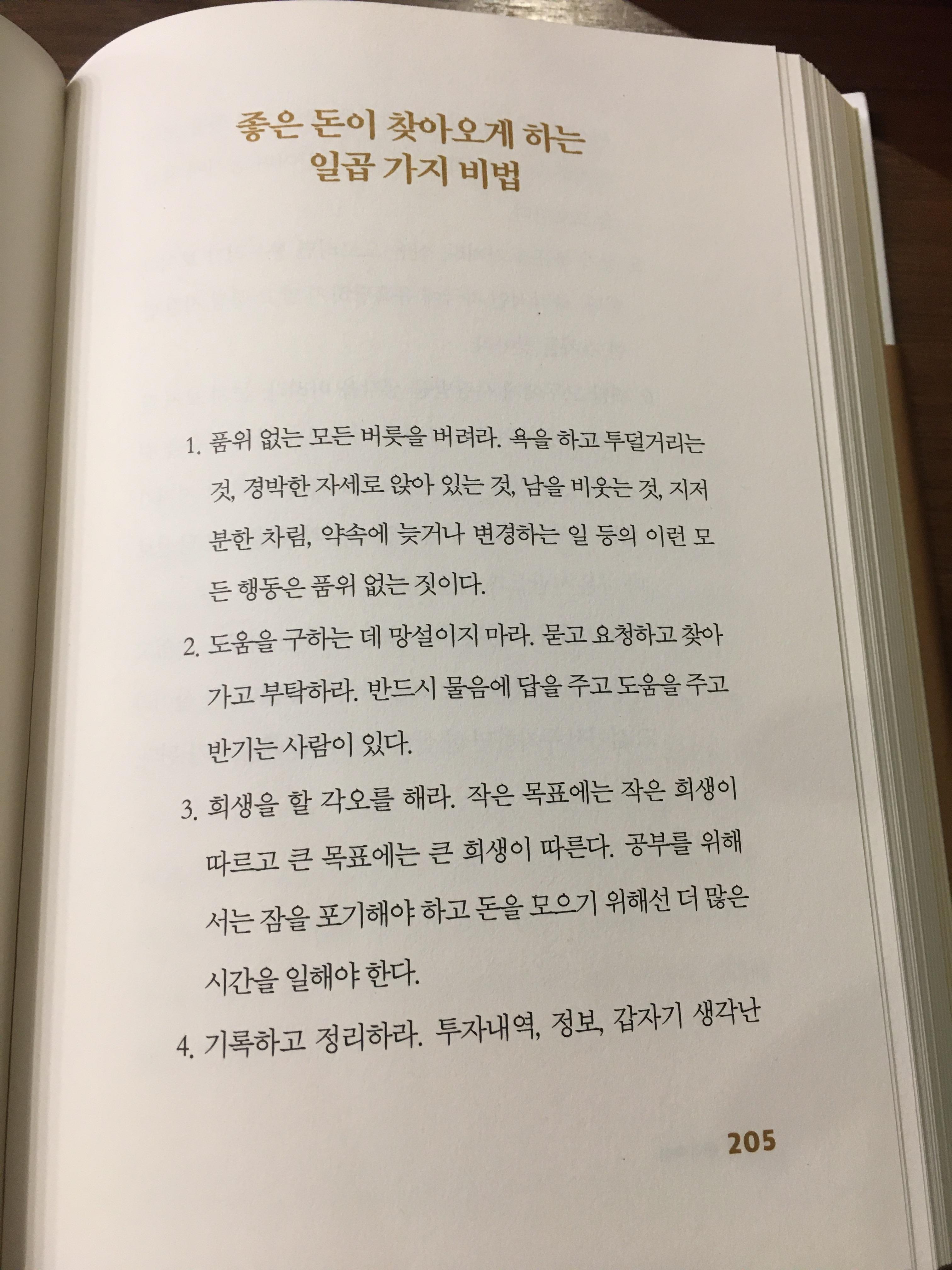 <좋은 돈이 찾아오게 하는 7가지 비법>에서 인상 깊은 부분을 한줄 요약하자면, 긍정적이며 성실하게 용기를 가지고 큰 그림에서 상생하는 마인드를 강조하는 것 같습니다.