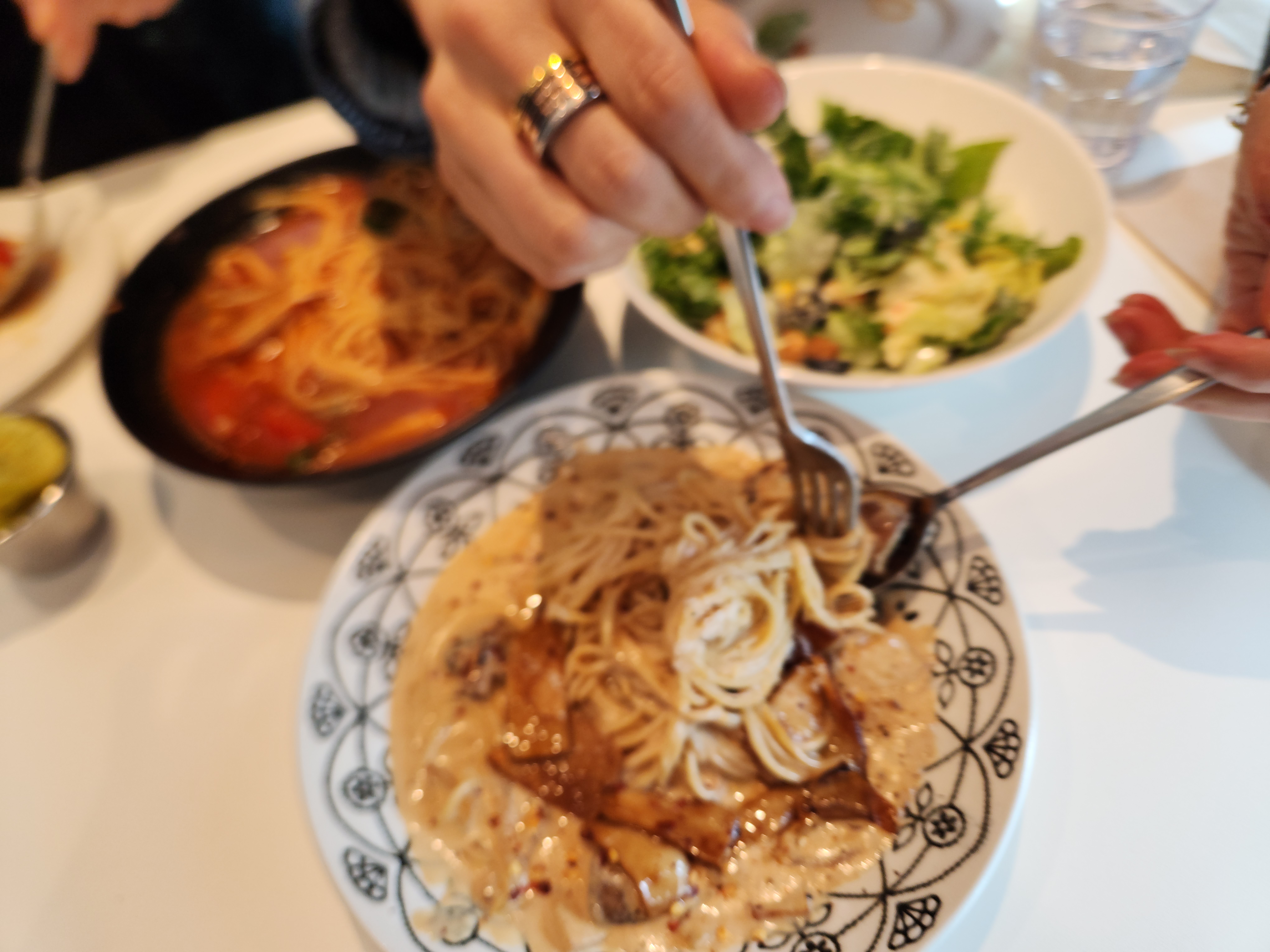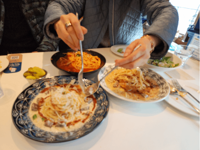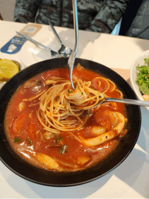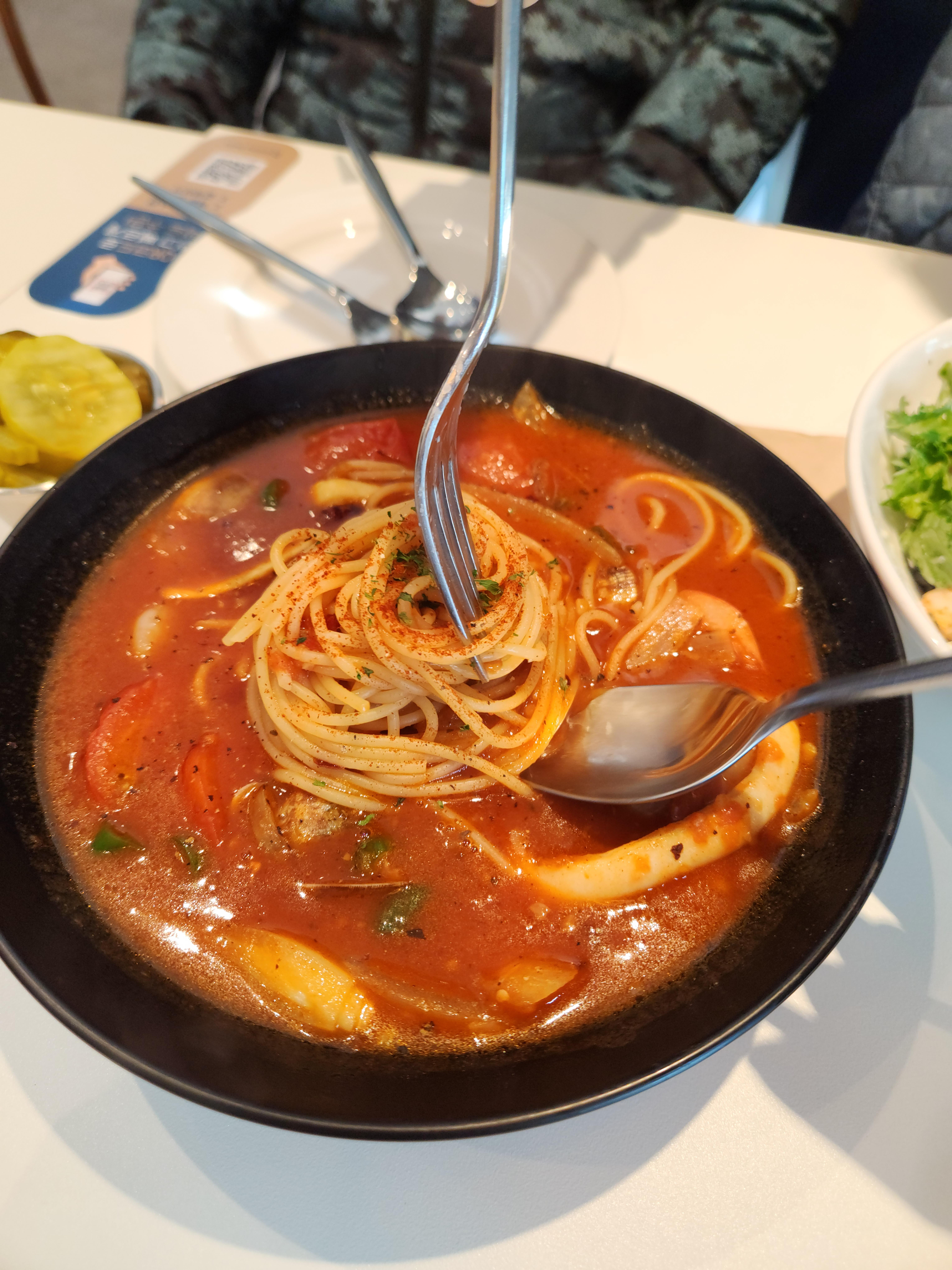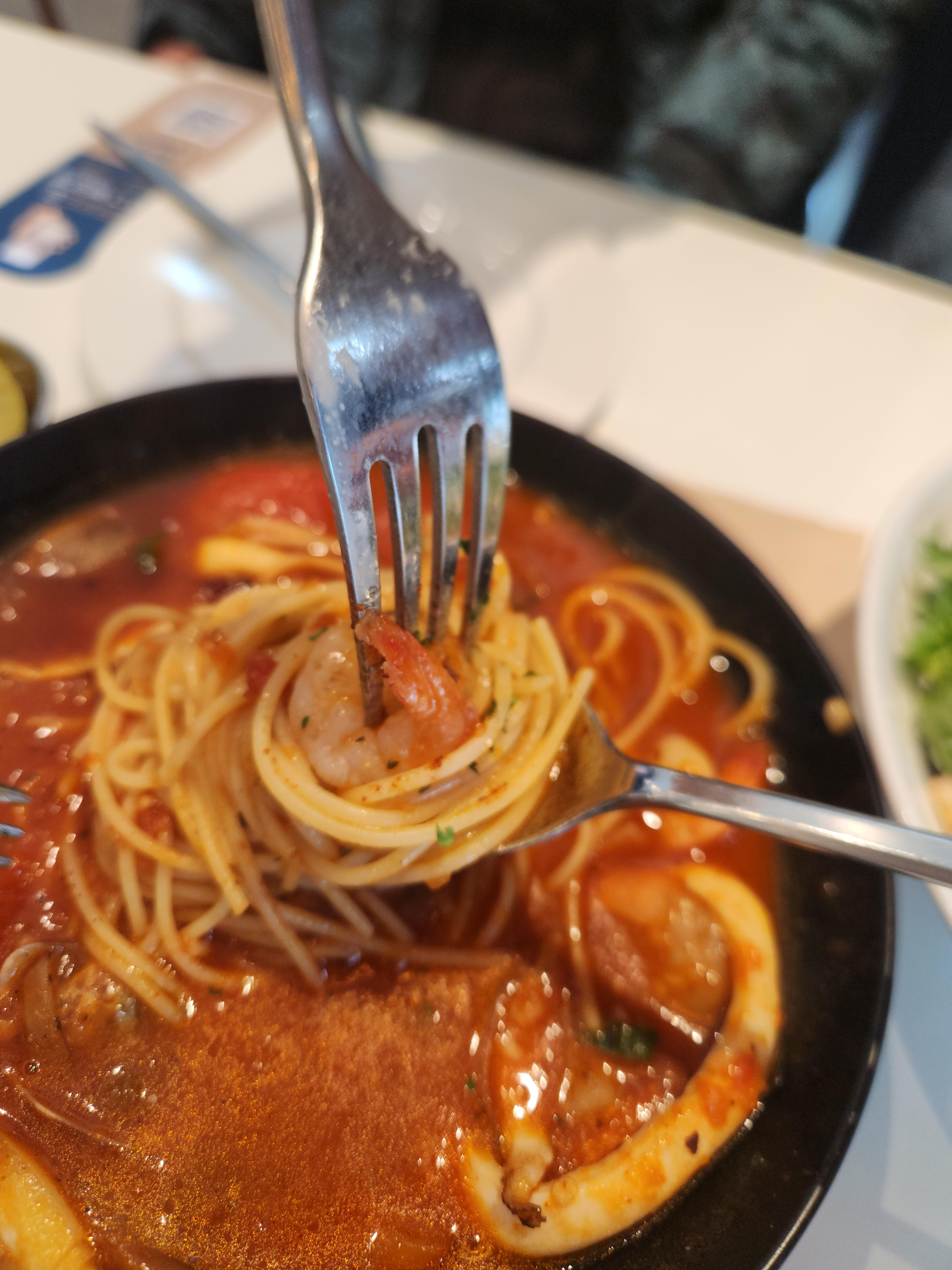 그리고 굿타이밍에 샐러드 반이상 먹자마자 빼쉐 파스타 등장! 이건 짬뽕같은 얼큰함인데 토마토 베이스랑 아주 잘 어우러져서 극강의 느끼함을 잡아주는 밸런스메뉴로 추천추천!! 어르신들이랑 간다면 요런 김치대체메뉴 하나는 있어줘야해요 ㅋㅋㅋ
