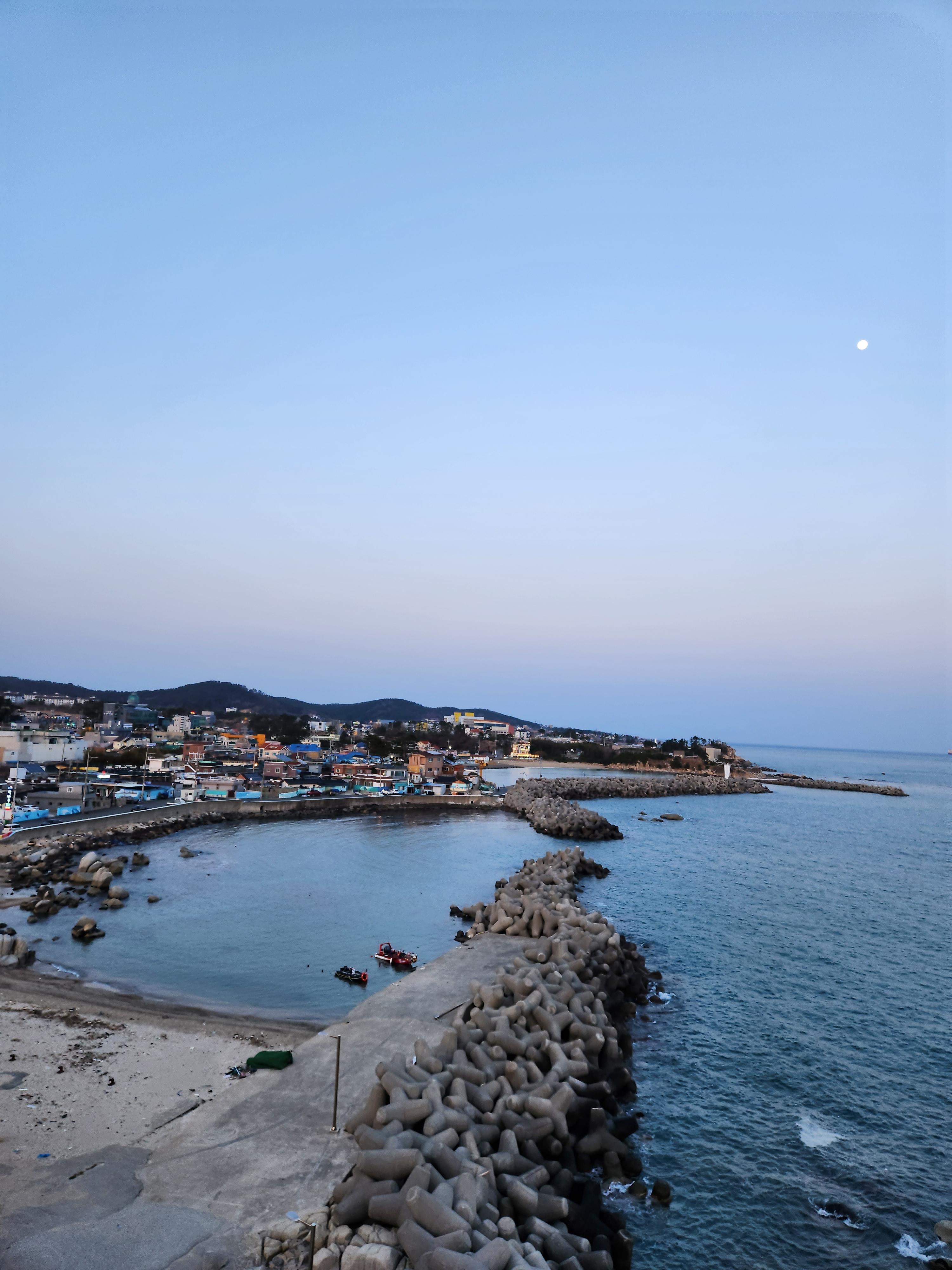 딱 이 시간이 바다와 하늘이 만나는 시간이었어서 더 인상 깊었던 거 같아요~ 점점 달이 진하고 선명해지는 깨끗하고 고요한 정취랄까요~