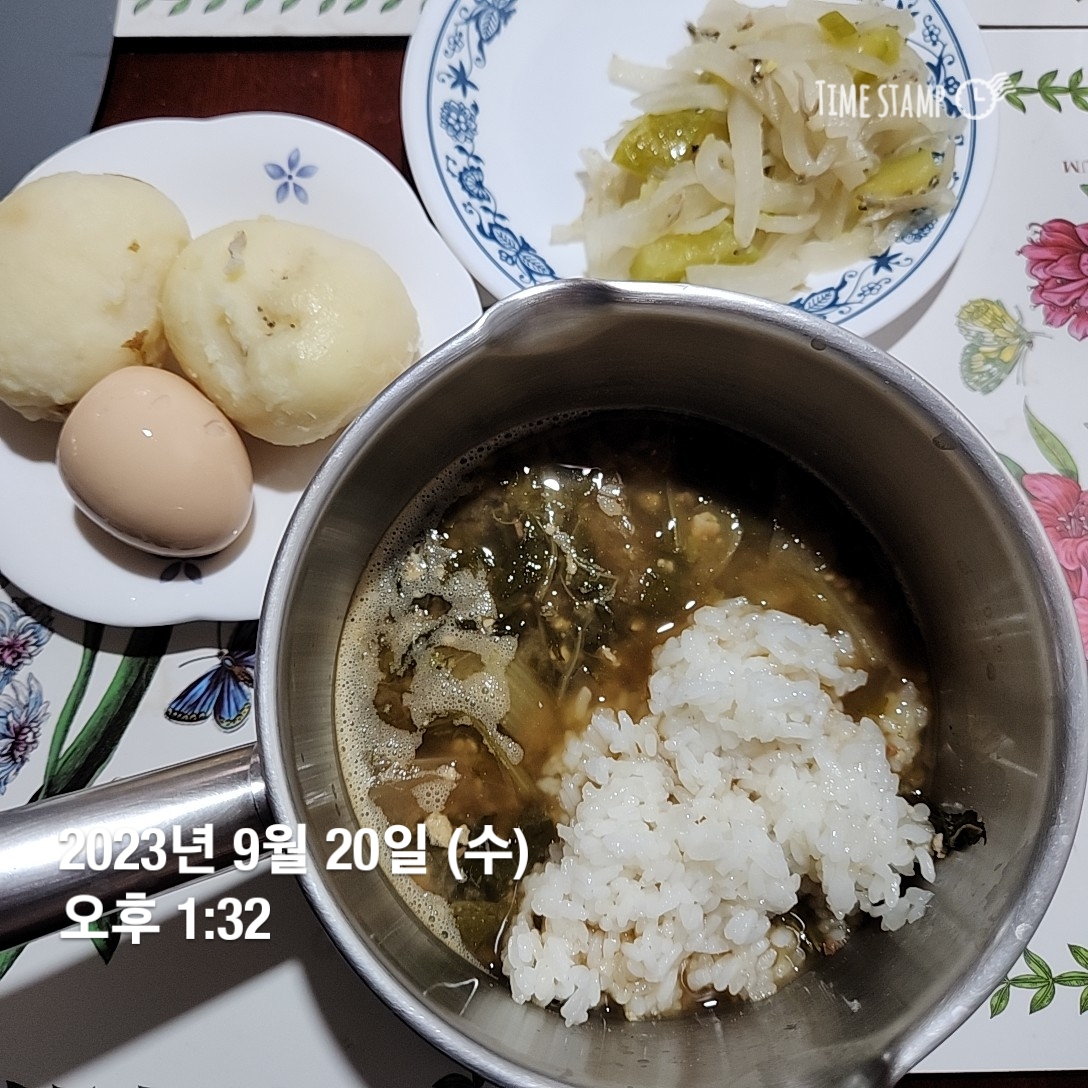 점심은 시래기된장국, 쌀밥, 삶은 무와 애호박무침, 삶은 감자2알, 계란1알