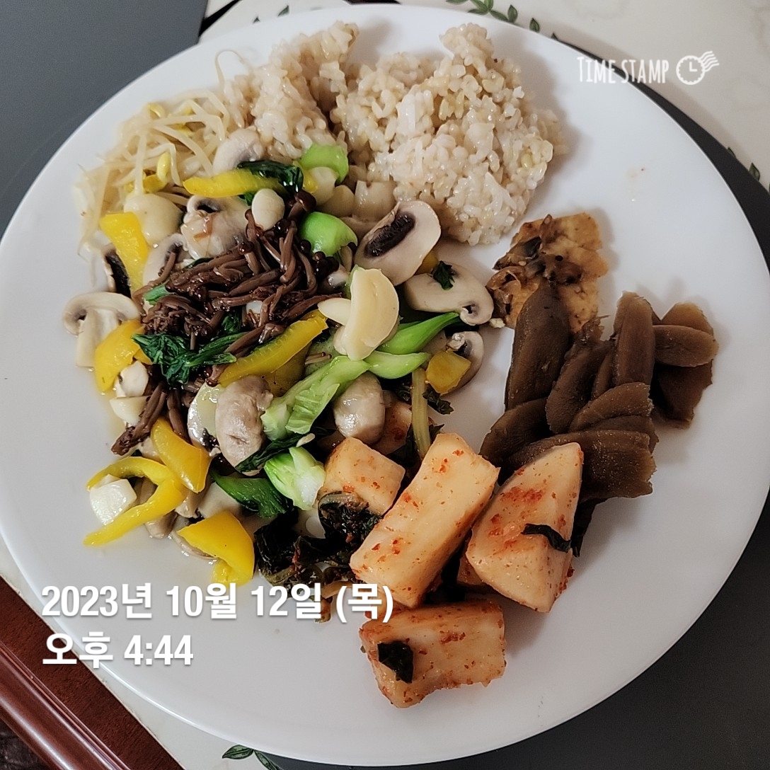 핑크솔트, 올리브오일+버섯두가지, 청경채, 마늘, 파프리카 볶음, 알타리무김치, 우엉조림, 콩나물무침, 두부구이한입, 현미밥**