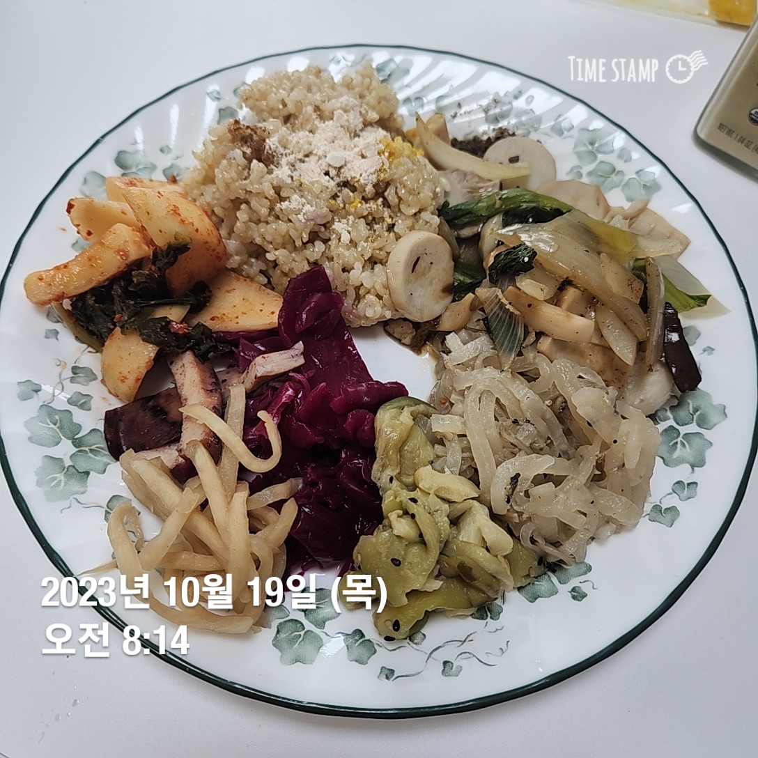 현미밥 알타리무김치 무생채 적채 가지무침 무나물 새송이버섯 청경채 흑마늘 양파